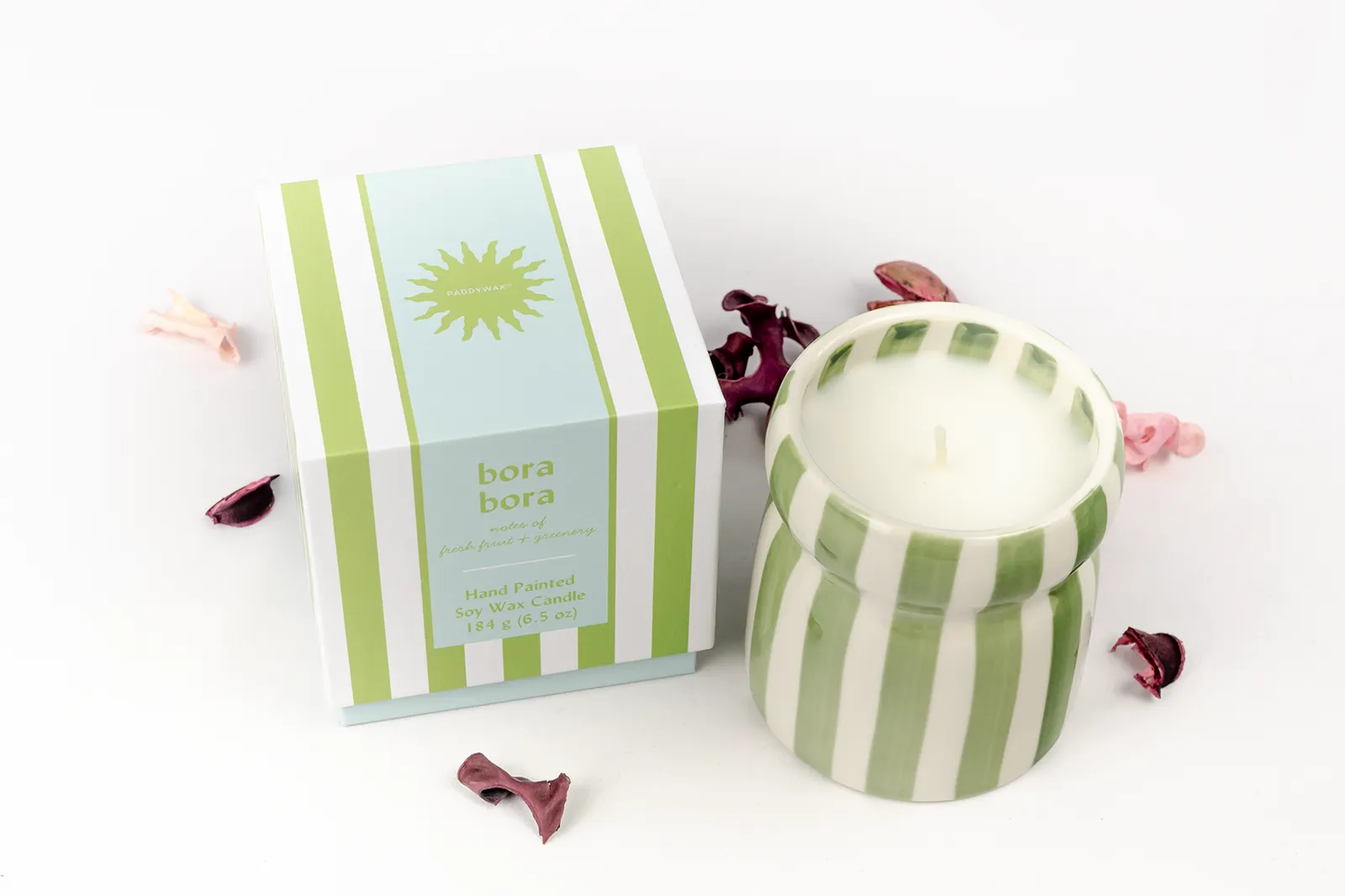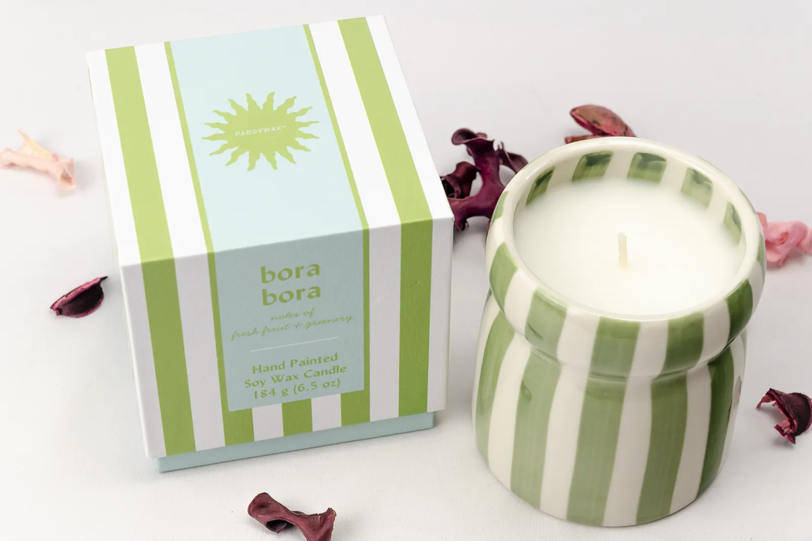- Vela Cabana - Bora Bora Paddywax: El vaso de esta vela tiene un diseño de rayas verdes y blancas pintado a mano, que lo convierte en una bonita pieza decorativa. Evoca los aromas relajantes que te harán viajar a las playas más hermosas del mundo.